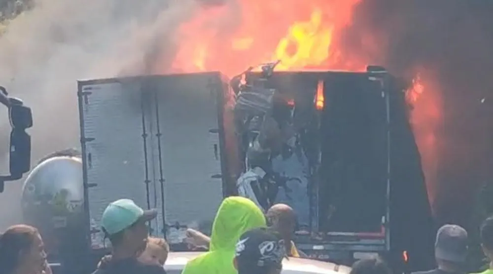 Incêndio de grandes proporções interdita Régis Bittencourt em Miracatu após engavetamento com carretas