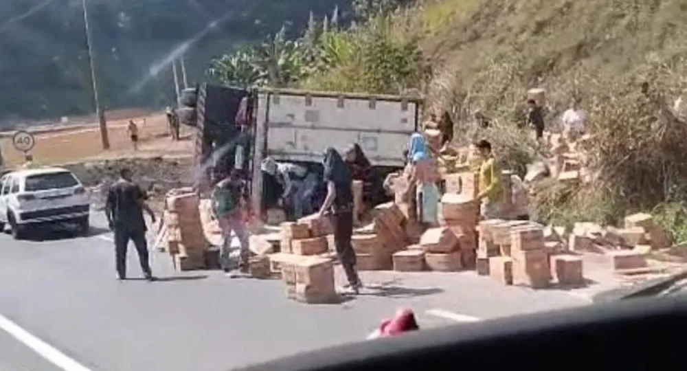 Motorista sofreu ferimentos leves; parte da carga foi saqueada após o acidente e acostamento segue bloqueado para remoção do veículo.