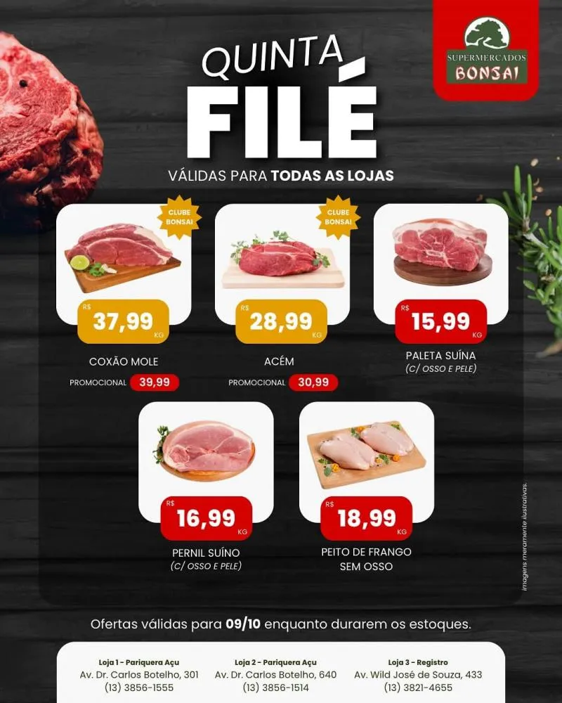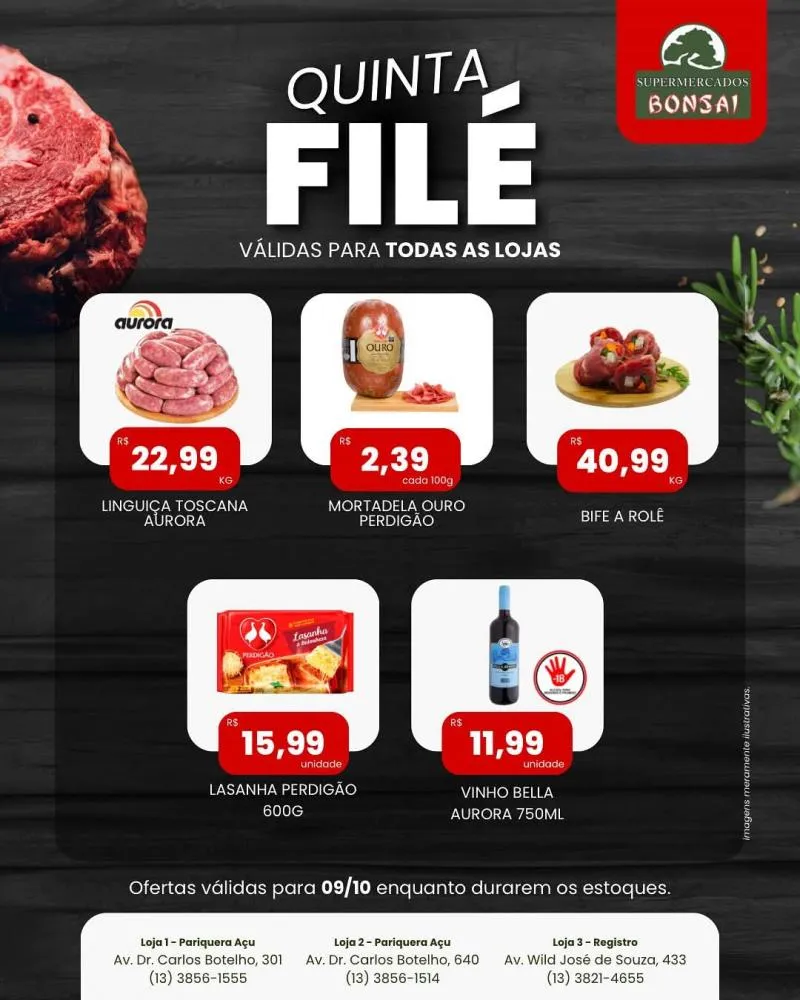 Os Supermercados Bonsai prepararam ofertas imperdíveis para esta quinta-feira, dentro da tradicional campanha "Quinta Filé", válida para todas as lojas da rede. As promoções seguem até o dia 9 de outubro de 2025 ou enquanto durarem os estoques.