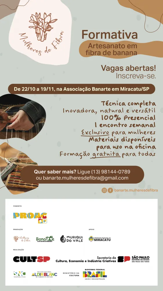 Quer saber mais? Ligue (13) 98144-0789 ou banarte.mulheresdefibra@gmail.com