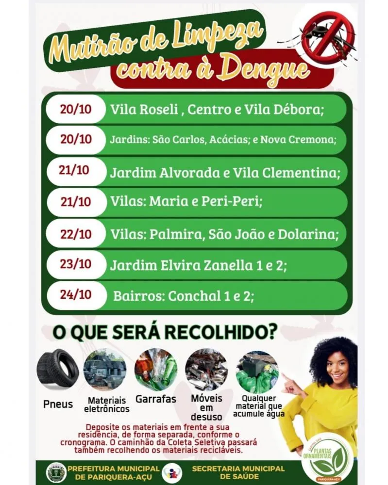 A coleta seguirá até o dia 24/10, passando por vários bairros conforme cronograma. Os moradores devem deixar os materiais em frente às residências, separados por tipo, para facilitar o recolhimento. Itens como pneus, garrafas, móveis velhos e eletrônicos serão recolhidos, além de recicláveis pela Coleta Seletiva.