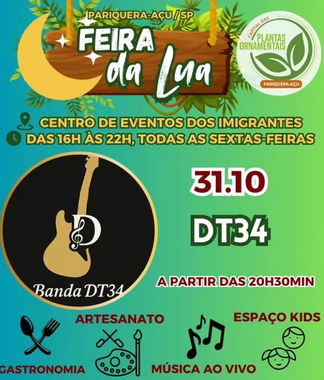 O clima acolhedor e familiar é um dos grandes atrativos da feira, que se tornou ponto de encontro de moradores e visitantes. E para animar ainda mais a noite, às 20h30 tem show ao vivo com a Banda DT34, prometendo muita música boa e diversão.