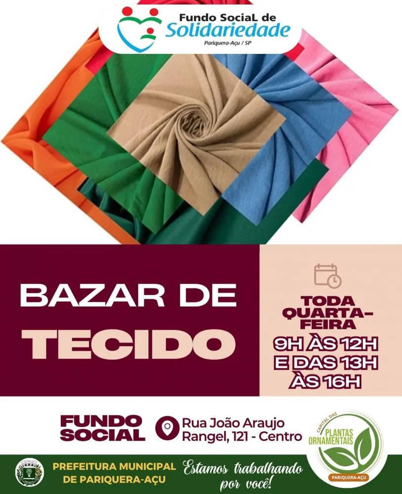 O Fundo Social de Solidariedade de Pariquera-Açu convida toda a população para participar do Grande Bazar de Tecidos (Crepe Duna), que tem início nesta quarta-feira, 12 de novembro, com atendimento das 9h às 12h e das 13h às 16h.