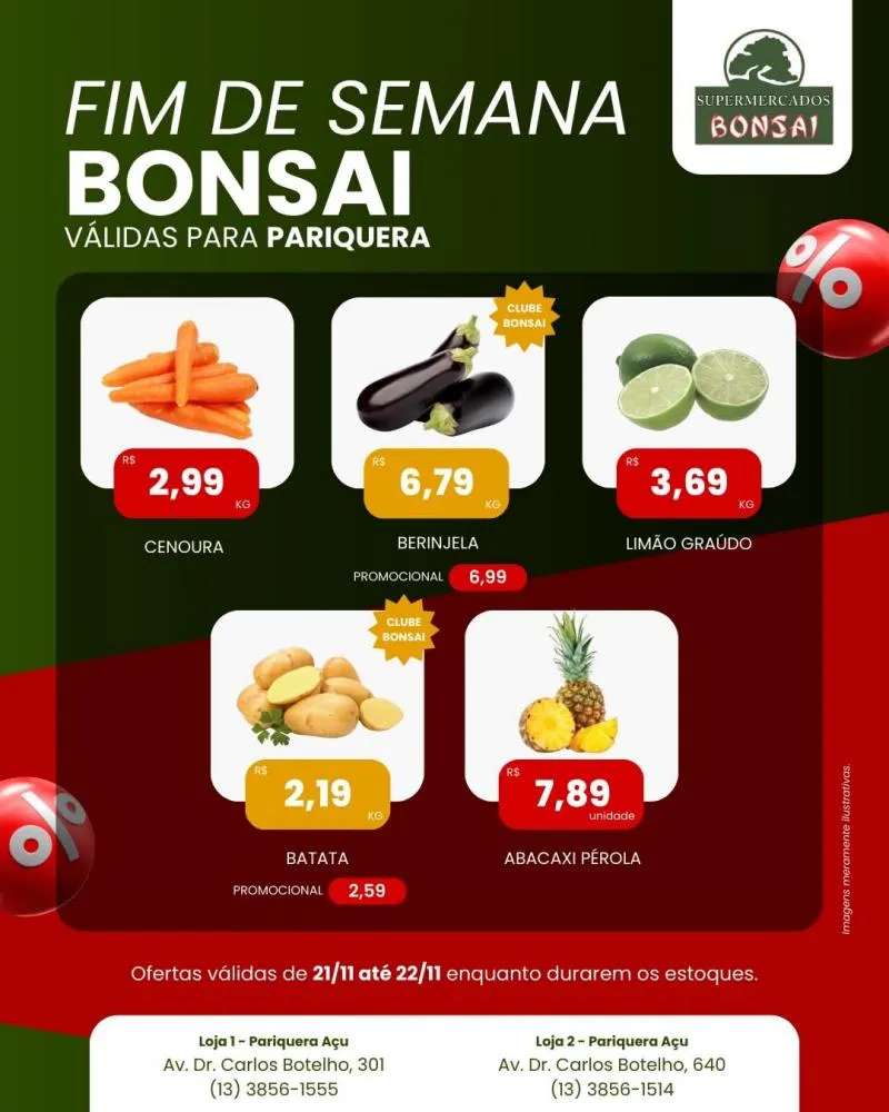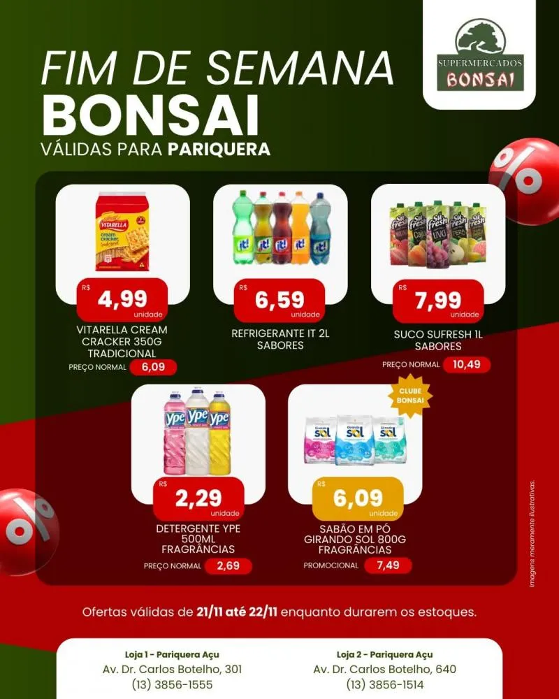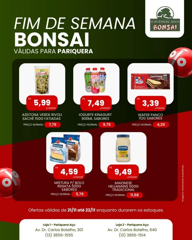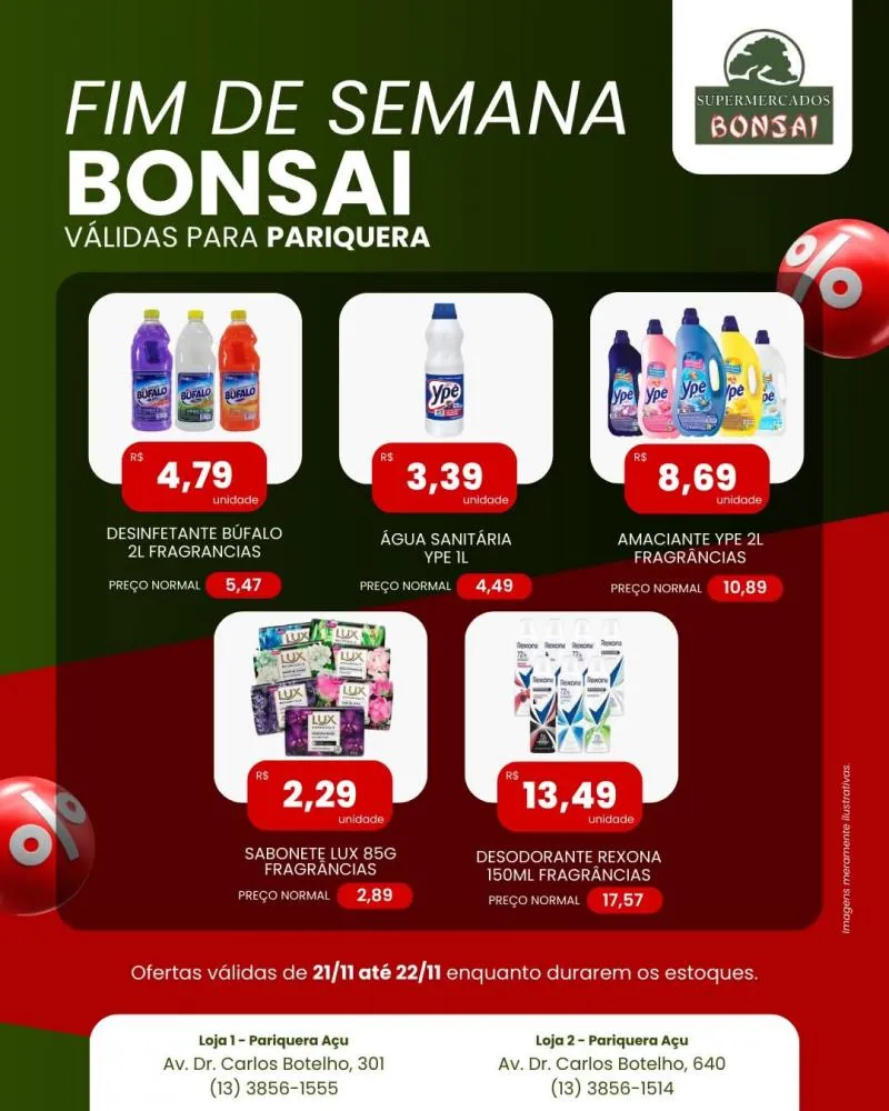 O Supermercado Bonsai lançou uma nova campanha de fim de semana com ofertas especiais para os consumidores de Pariquera-Açu. As promoções são válidas nos dias 21 e 22 de novembro (quinta e sexta-feira), ou enquanto durarem os estoques, e contemplam itens essenciais de higiene pessoal e limpeza com descontos atrativos.