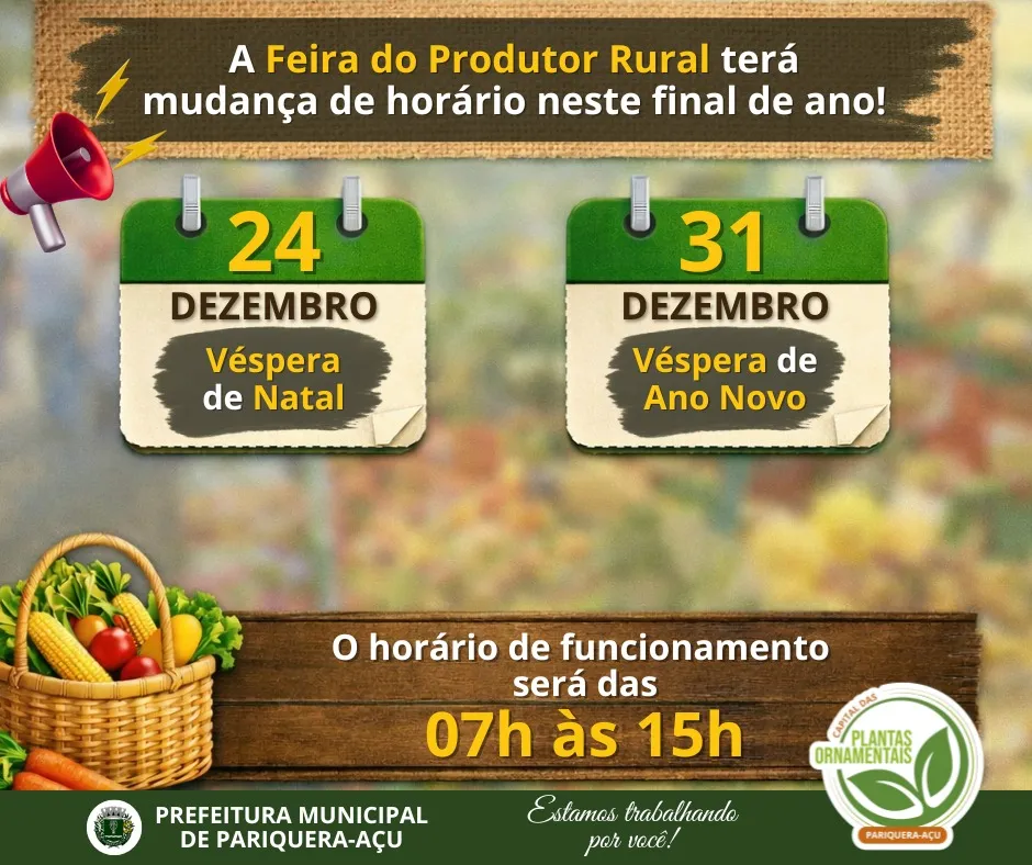 A tradicional Feira do Produtor Rural de Pariquera-Açu, realizada às quartas-feiras na Rua Romeu Monti, terá alteração no horário de funcionamento nos dias 24 e 31 de dezembro, vésperas de Natal e Ano Novo.