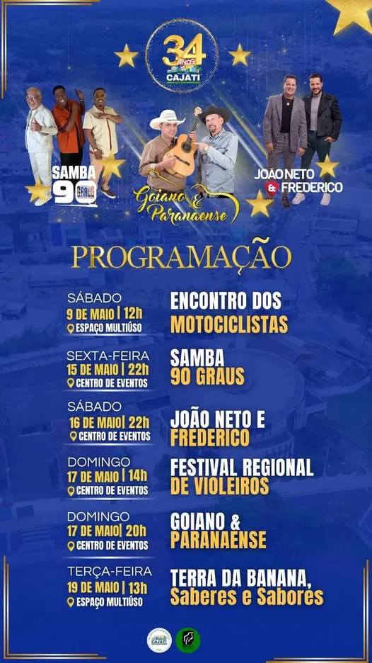 A Secretaria de Cultura e Turismo da Prefeitura de Cajati anunciou a programação oficial em comemoração aos 34 anos de Emancipação Política e Administrativa do município.