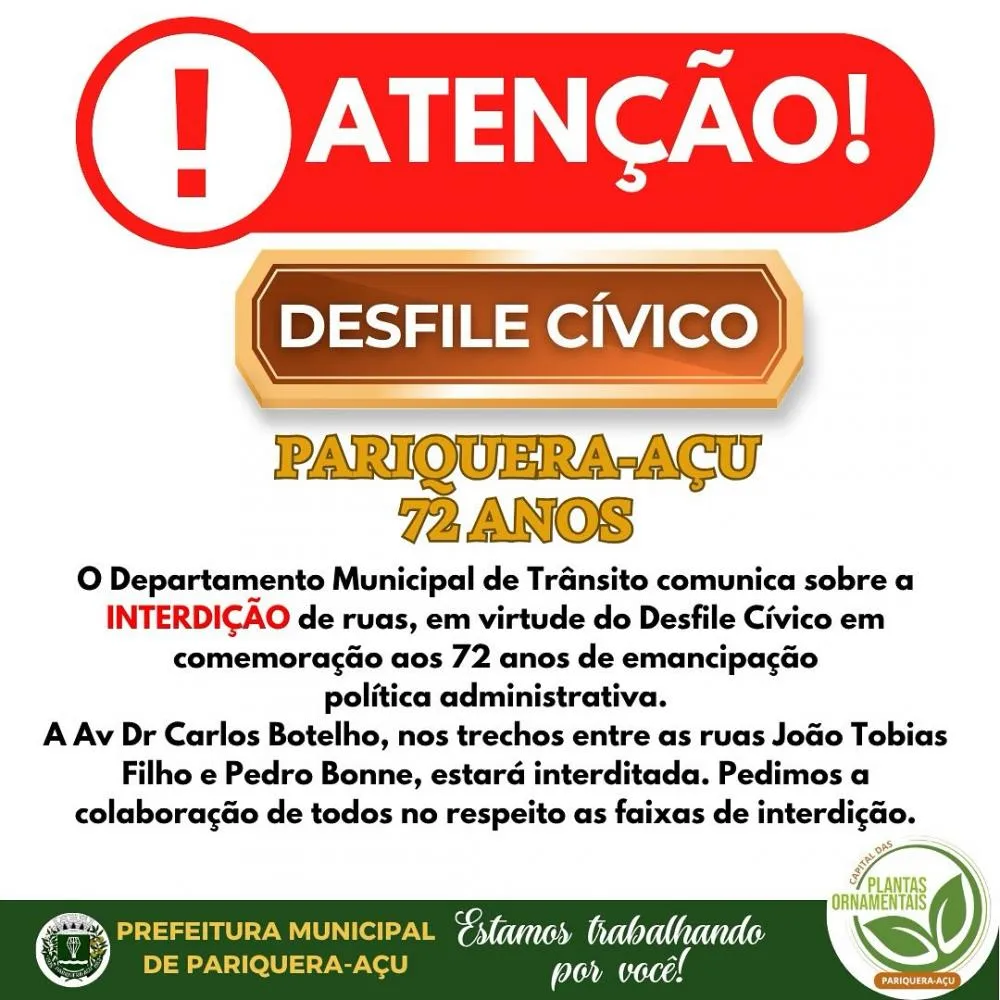 Trecho da Avenida Dr. Carlos Botelho será interditado em virtude das comemorações de emancipação político-administrativa