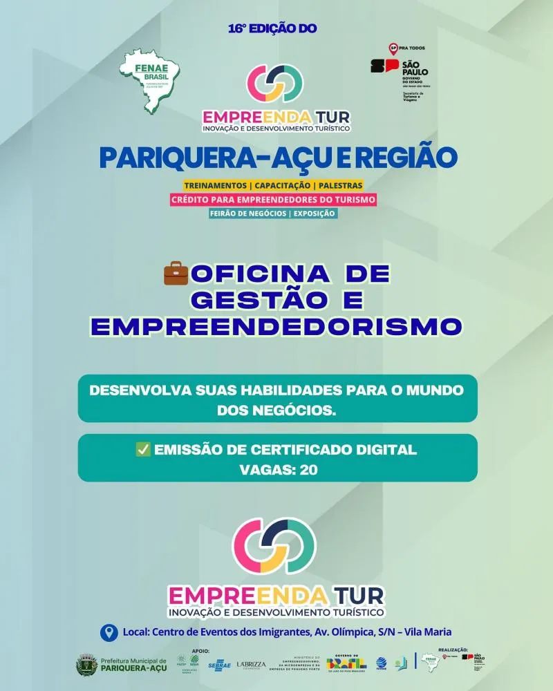 Pariquera-Açu recebe Oficina de Gestão e Empreendedorismo neste sábado (11), dentro do Empreenda Tur